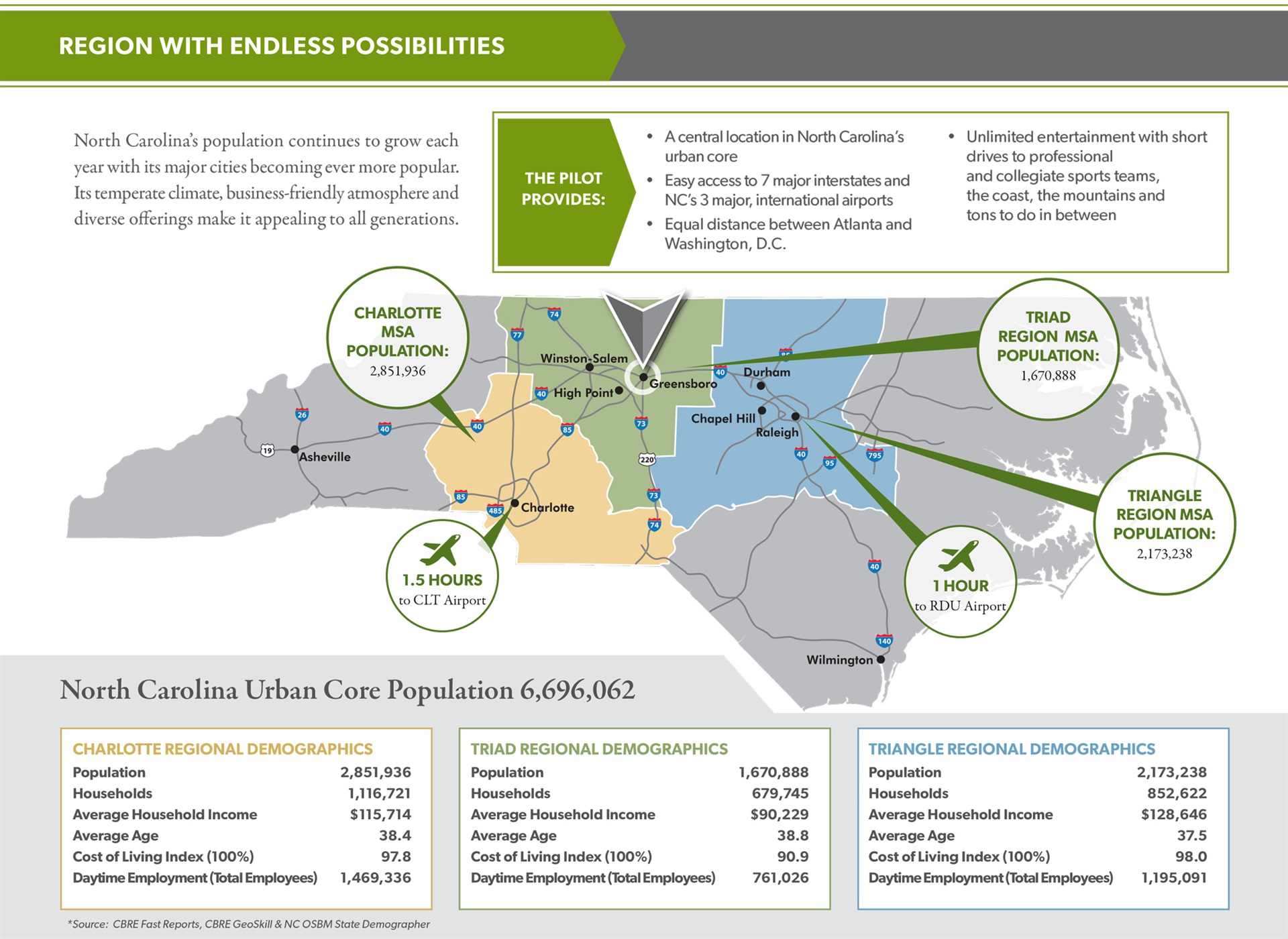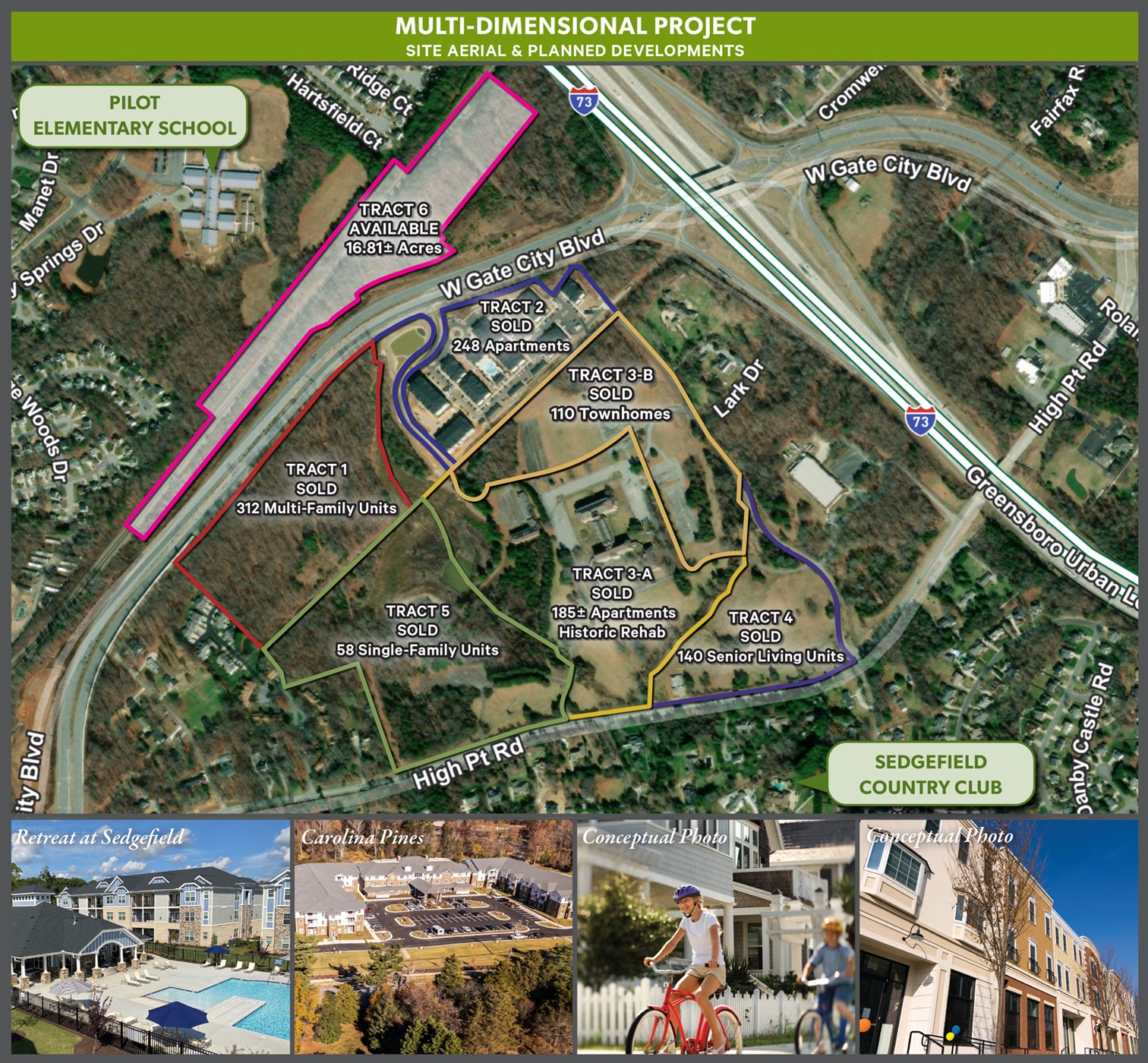 CBRE is pleased to offer for sale The Pilot at Sedgefield. The original campus was 131 acres with seven tracts of land available for development. The property was previously the headquarters for Pilot Life Insurance Company. Potential uses for the project include Convenience Store, Travel Center, Self-Storage, Car Wash, Pharmacy, Retail, RV Storage, EV Charging Stations, and Auto “Cave” Condos. Its location near the new Greensboro Urban Loop (I-73) and Gate City Boulevard (Jamestown Bypass) creates tremendous potential for a multi-use planned development. INVESTMENT HIGHLIGHTS