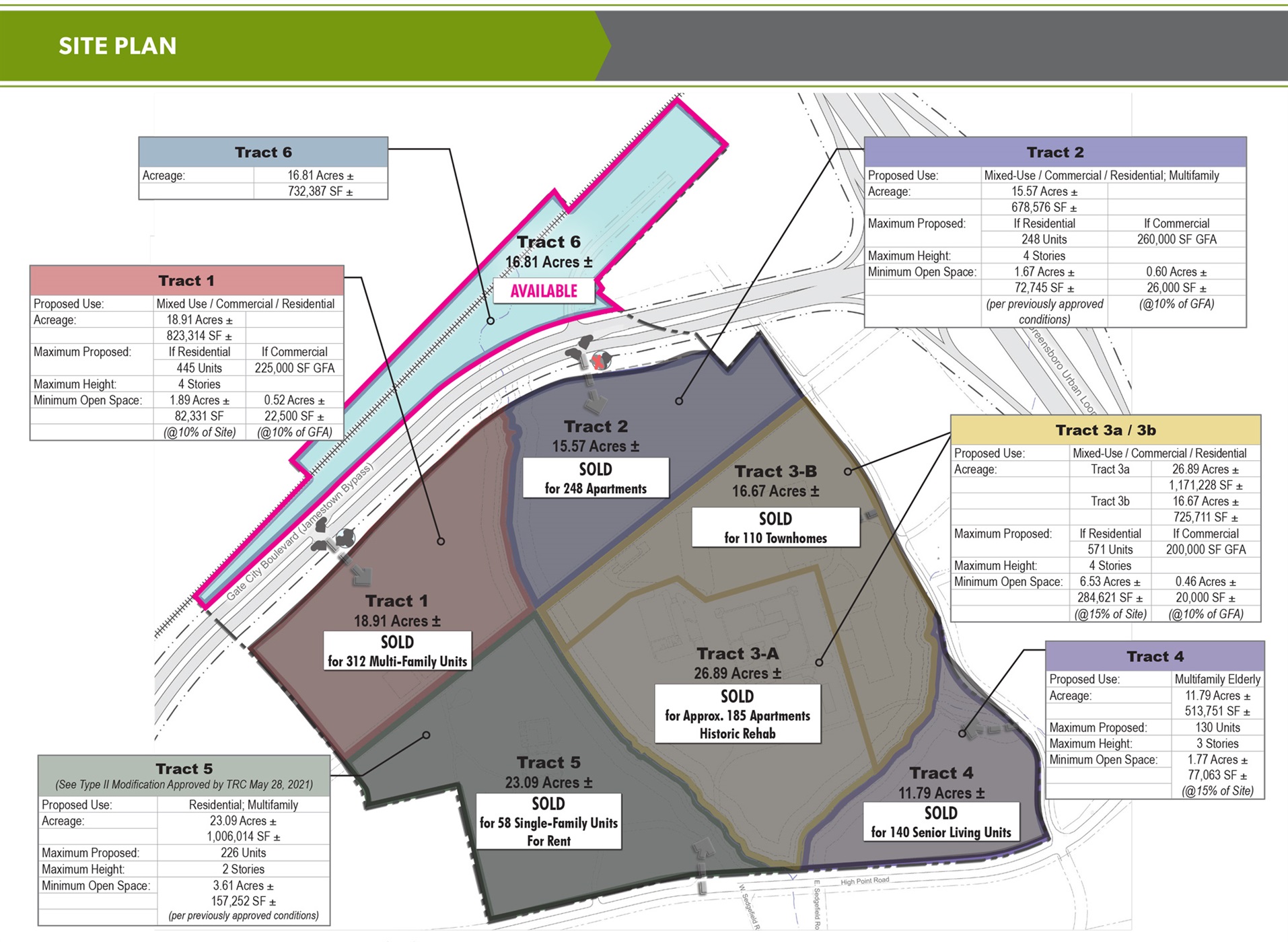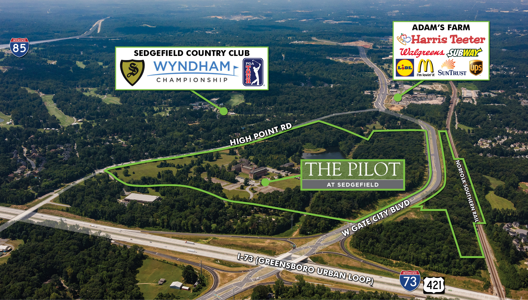 CBRE is pleased to offer for sale The Pilot at Sedgefield. The original campus was 131 acres with seven tracts of land available for development. The property was previously the headquarters for Pilot Life Insurance Company. Potential uses for the project include Convenience Store, Travel Center, Self-Storage, Car Wash, Pharmacy, Retail, RV Storage, EV Charging Stations, and Auto “Cave” Condos. Its location near the new Greensboro Urban Loop (I-73) and Gate City Boulevard (Jamestown Bypass) creates tremendous potential for a multi-use planned development. INVESTMENT HIGHLIGHTS